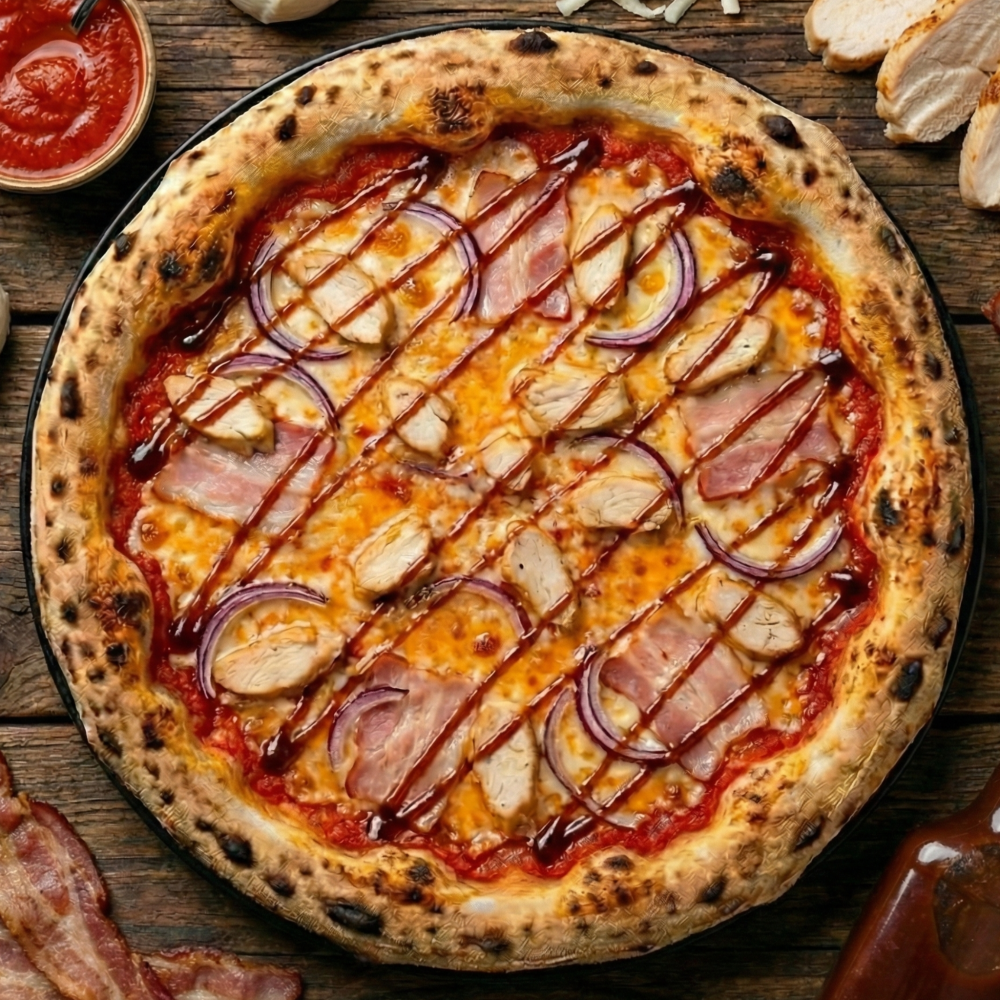 Фирменный томатный соус, сыр "Моцарелла", куриная грудка, бекон, красный лук, соус "Барбекю".