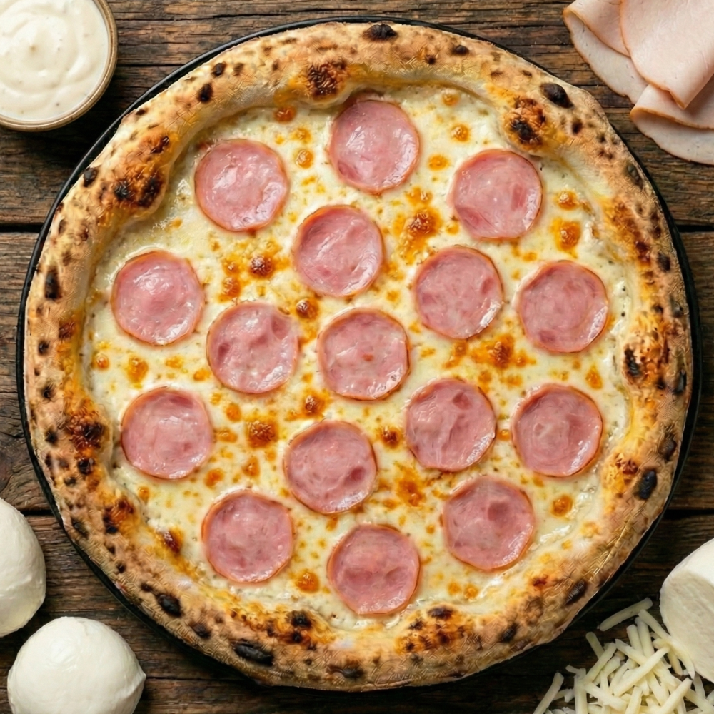 Соус белый, ветчина куриная, сыр "Моцарелла".