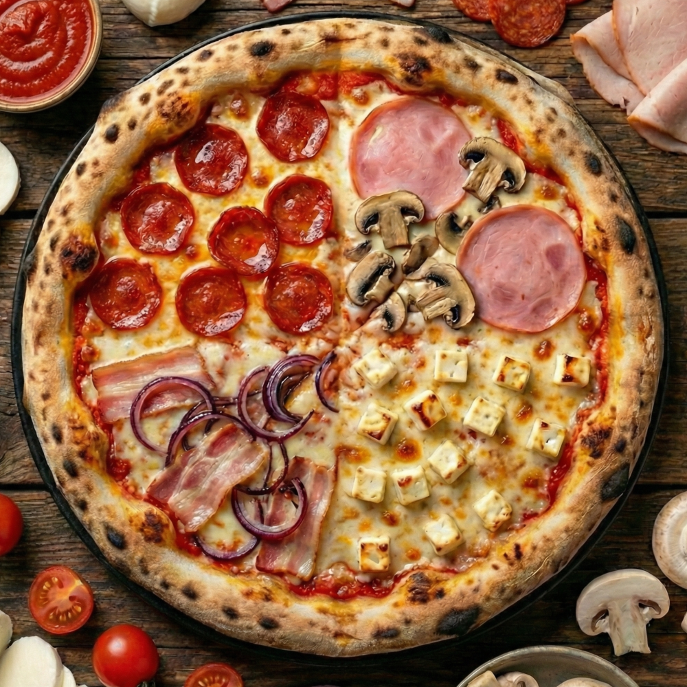Фирменный томатный соус, сыр "Моцарелла", бекон, "Пепперони", ветчина куриная, шампиньоны, сыр "Фетакса", лук красный.