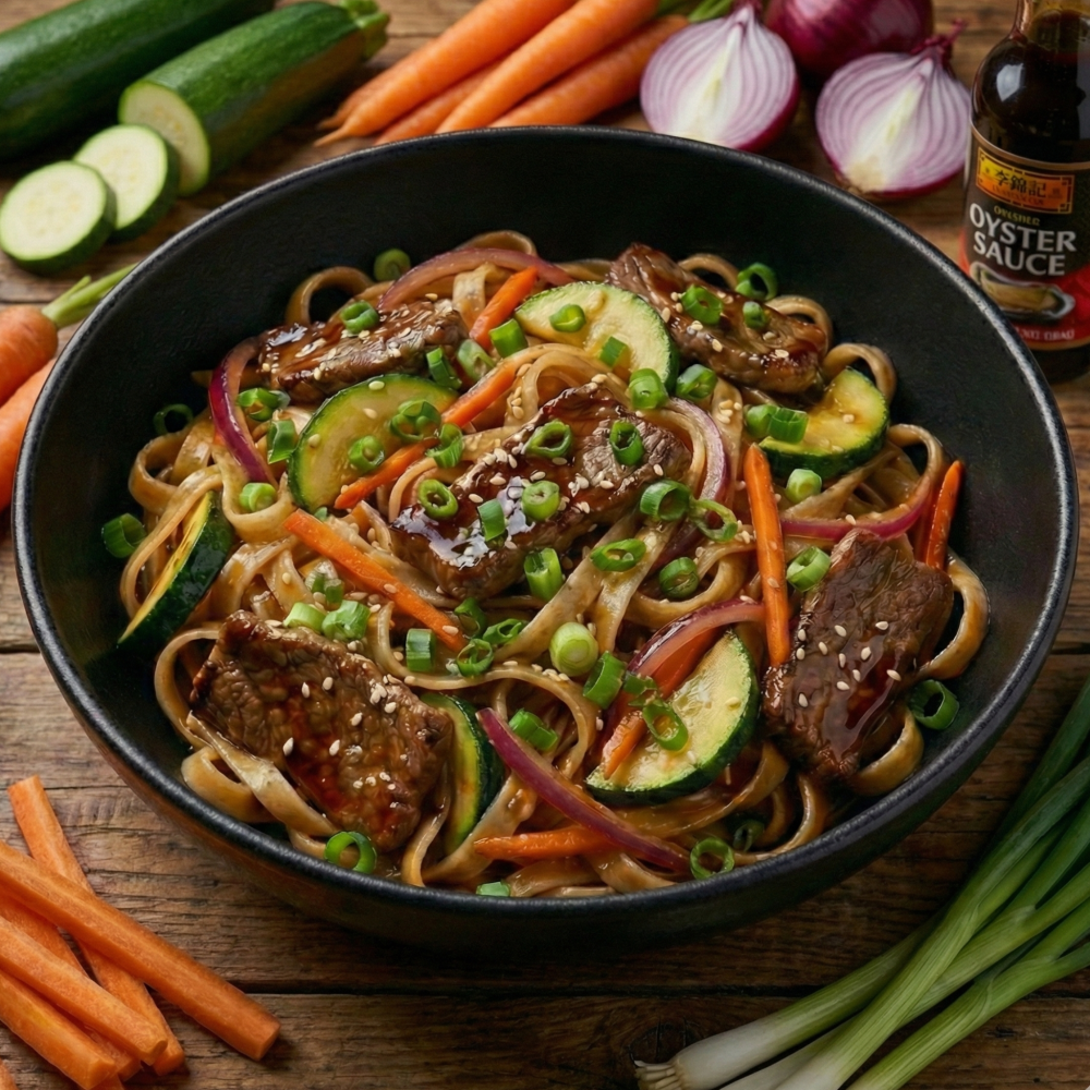Удон лапша, цукини, морковь, лук , говядина, соус "Устричный" (фирменный), кунжут, зеленый лук.