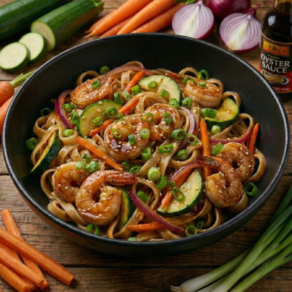 Удон лапша, цукини, морковь, лук , креветки, соус "Устричный" (фирменный), кунжут, зеленый лук.