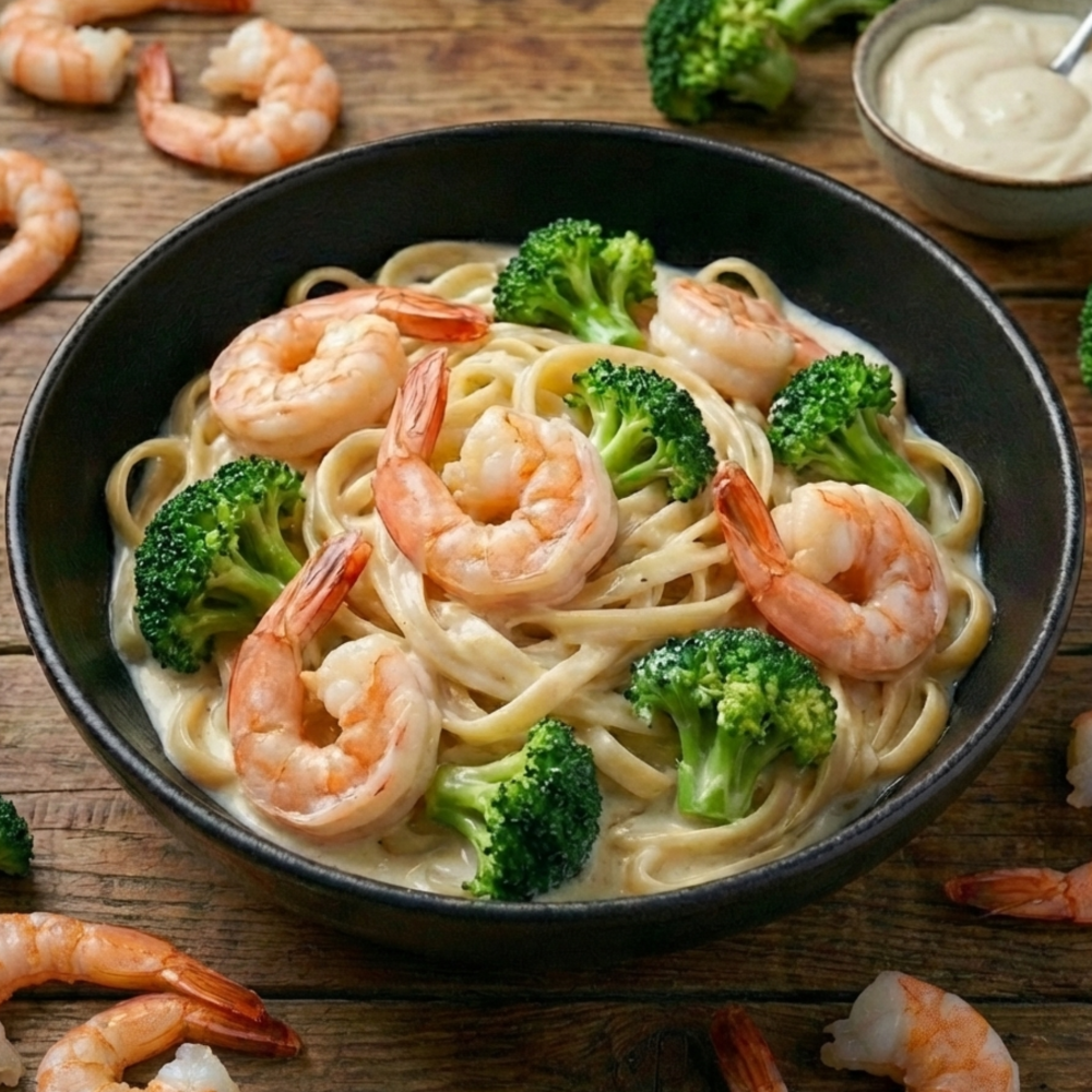 Удон лапша, брокколи, королевская креветка, соус "Сливочный".