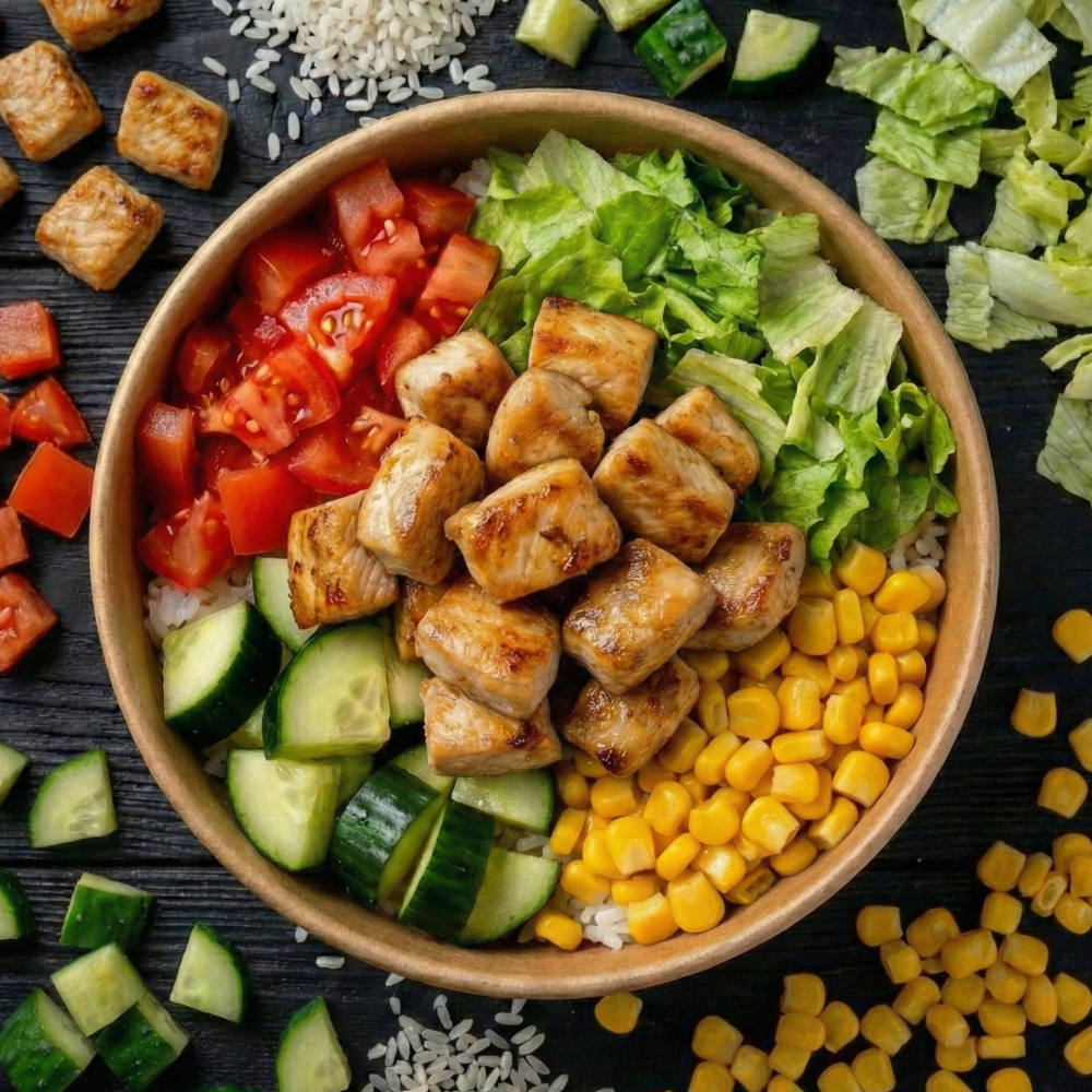 Рис, курица, салат "Айсберг", кукуруза, помидор, огурец, соус "Ореховый", соус "Майо".