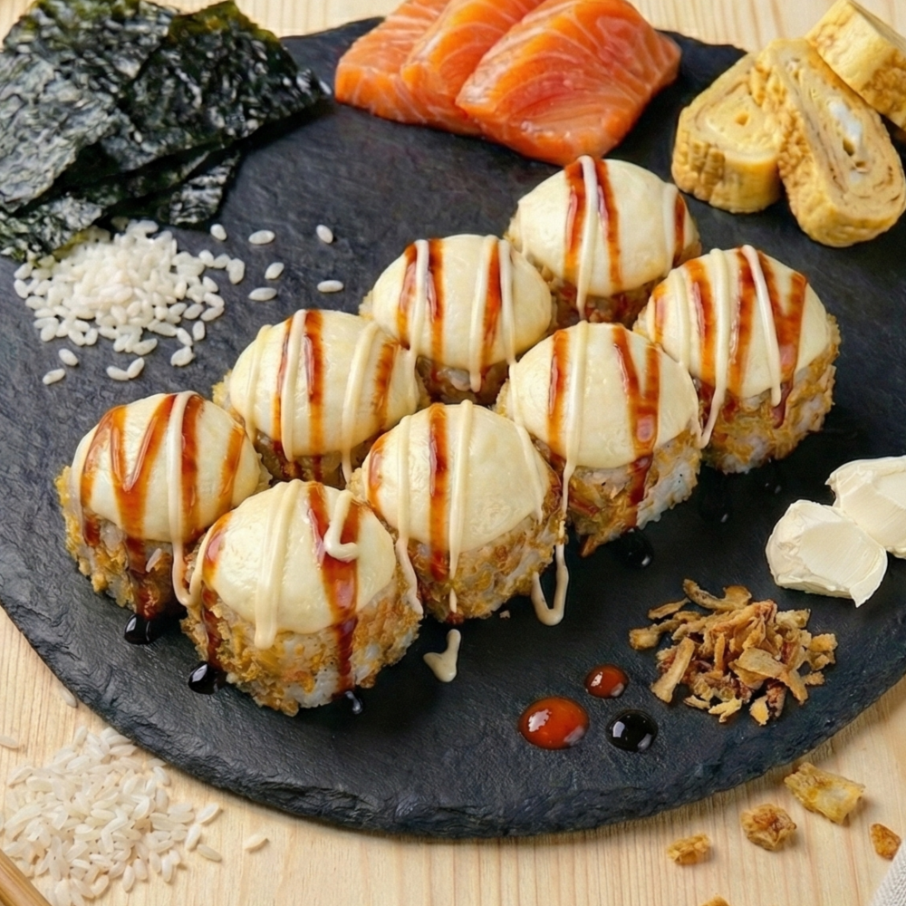 Рис, нори, творожный сыр, лосось, омлет "Томаго", хрустящий лук фри, соус "Спайси", соус "Унаги".