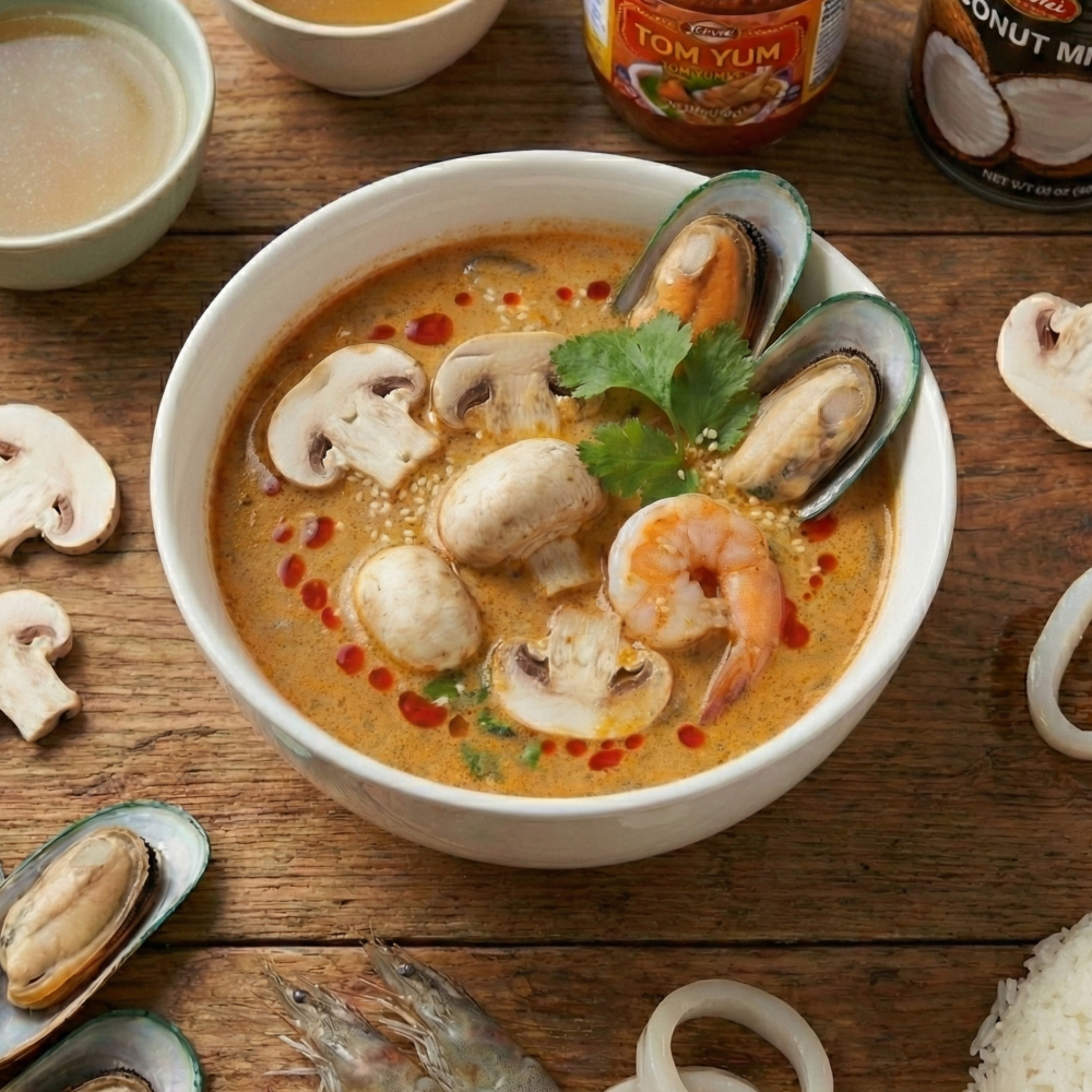 Тайский бульон, паста "Том Ям", кокосовое молоко, шампиньоны, мидии, креветки, кальмары, рис.
