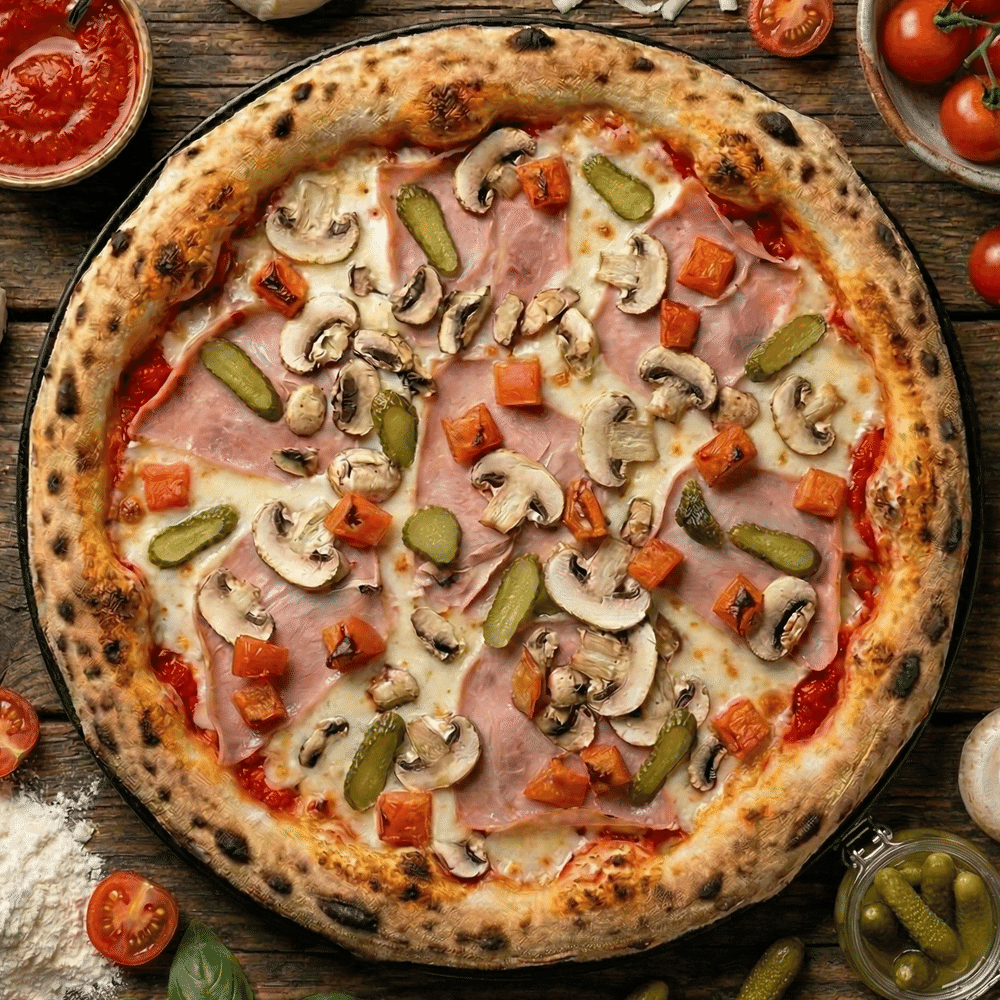 Соус томатный, сыр моцарелла, куриная ветчина, томаты, грибы шампиньоны, маринованные огурчики