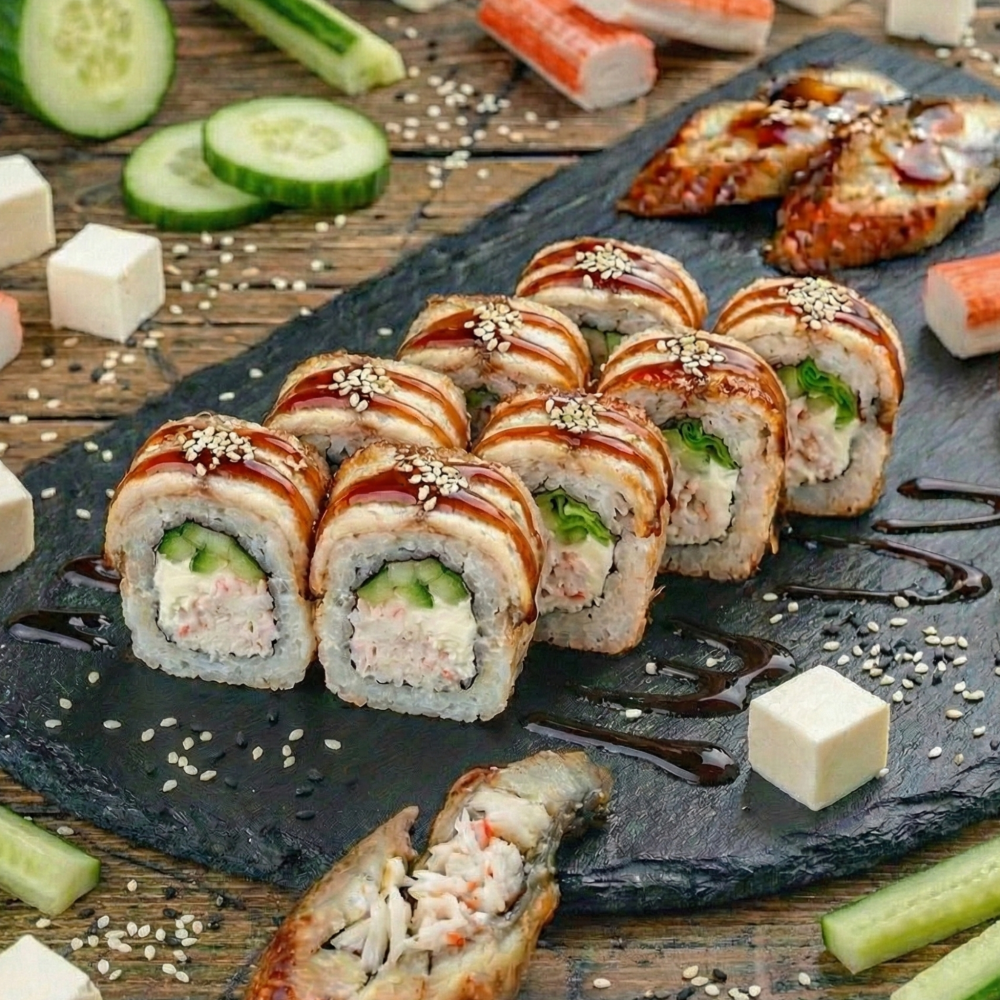 Сыр, угорь, краб, огурец, унаги, кунжут.