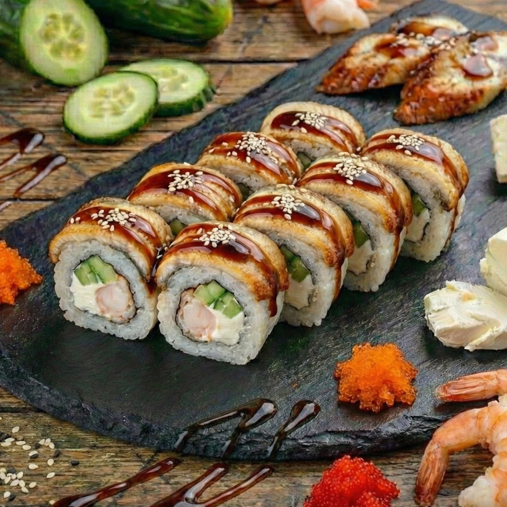 Сыр, угорь, креветка, огурец, икра масаго, унаги соус, кунжут.