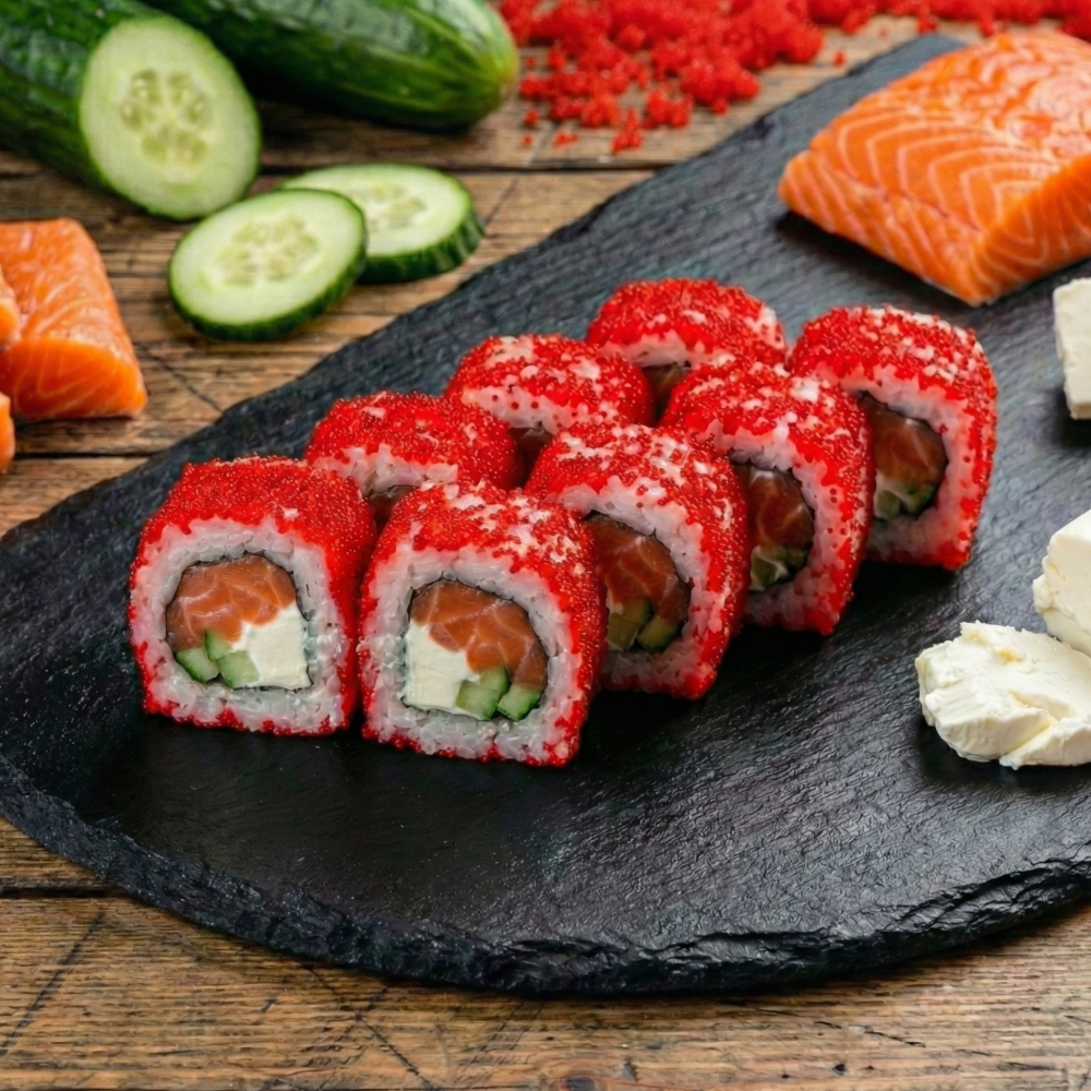 Сыр, огурец, лосось, икра "Масаго".