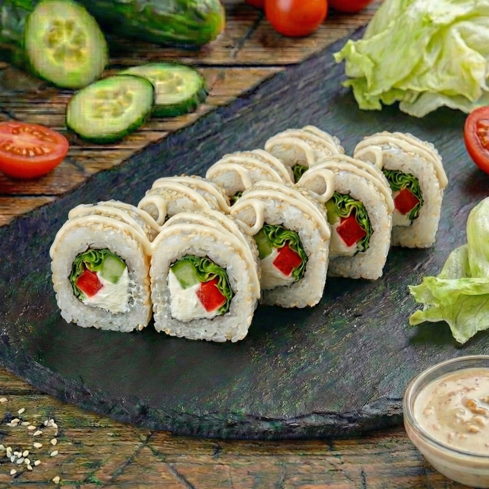Сыр, салат "Айсберг", огурец, помидор, ореховый соус, кунжут.