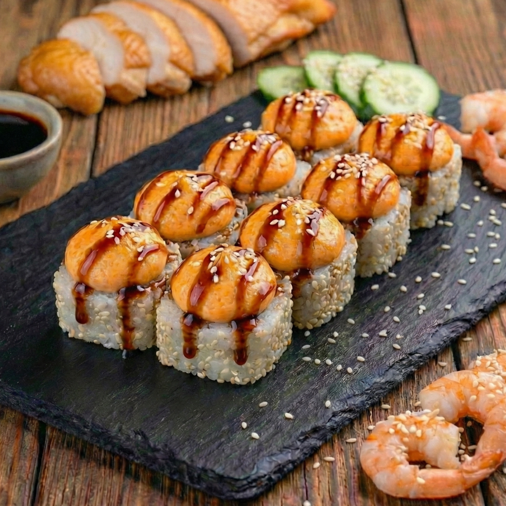 Сыр,Копченная Курица,Огурец,Креветка,Кунжут,Соус Унаги