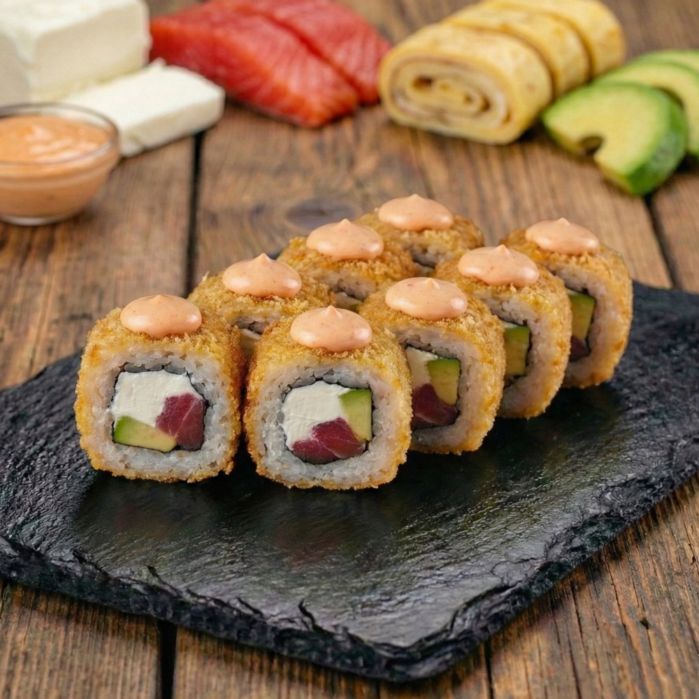 Сыр, красная рыба, омлет "Томаго", авокадо, соус "Спайси".