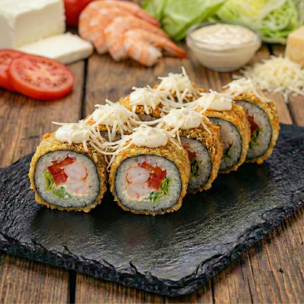Сыр, помидор, креветка, салат "Айсберг", соус "Цезарь", сыр "Пармезан".