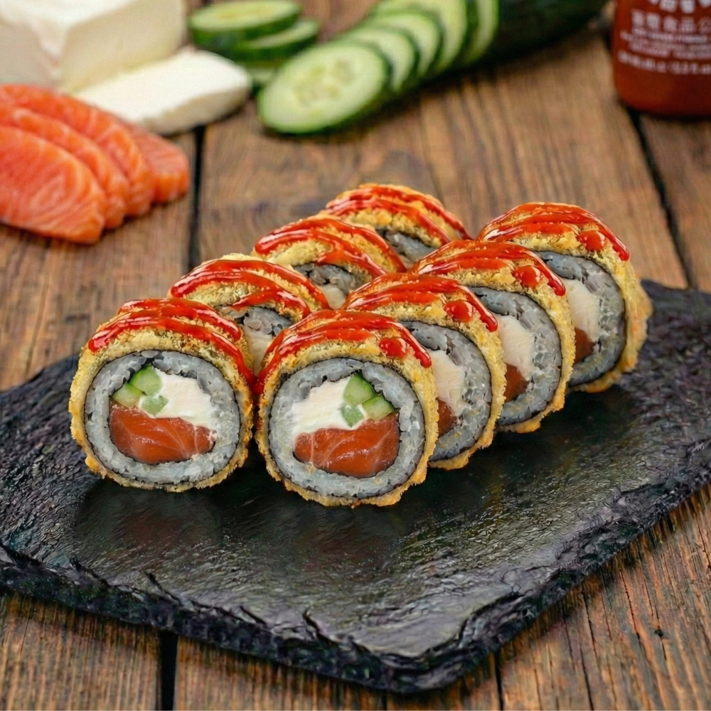 Сыр, красная рыба, огурец, соус "Шрирача".