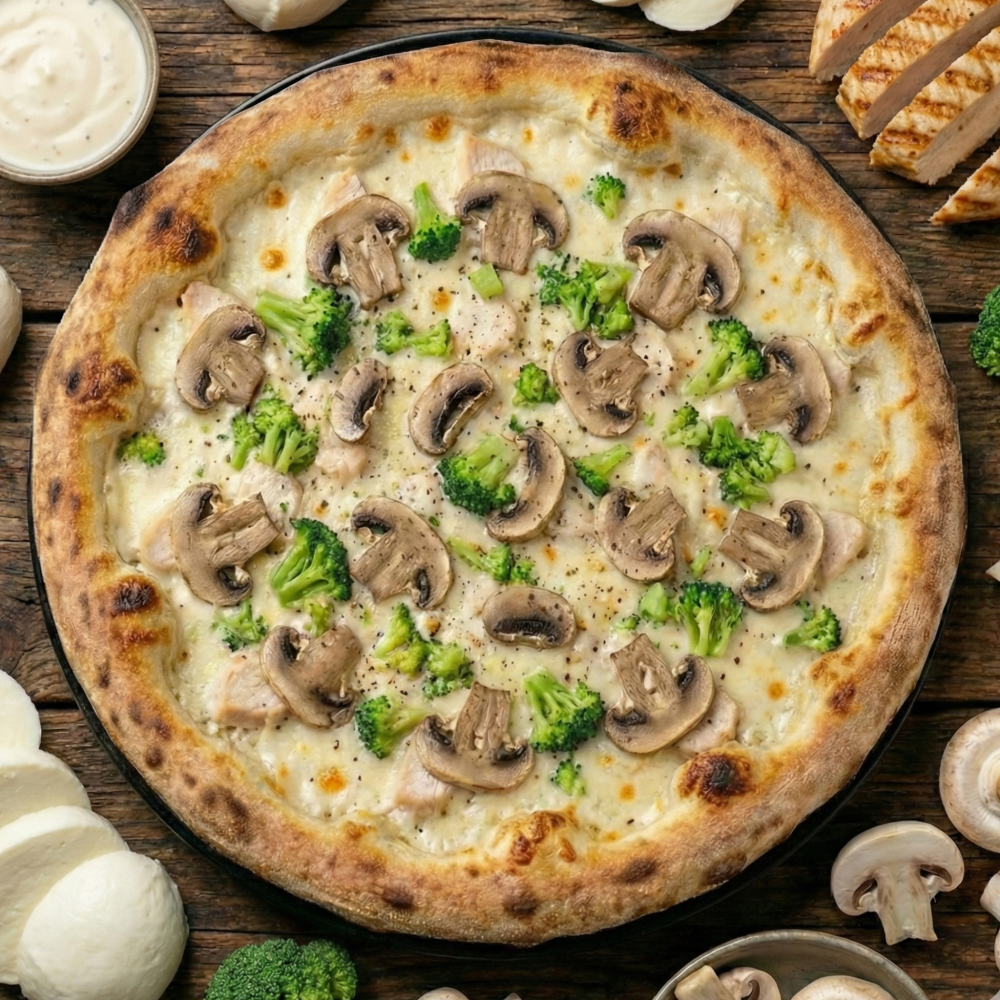 Соус белый, сыр "Моцарелла", курица, шампиньоны, брокколи.
