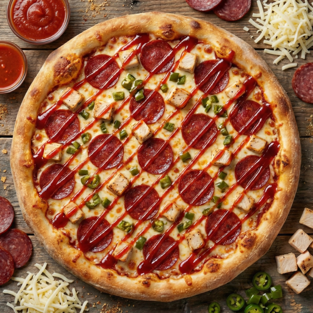 Фирменнй томатный соус, сыр "Моцарелла", куриная грудка, "Пеперони", халапеньо, соус "Шрирача".